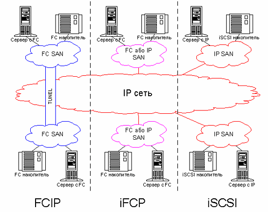 FCIP — созданный на базе TCP/IP туннельный протокол, функцией которого является соединение географически отдаленных FC SAN без какого-либо влияния на FC и IP протоколы.
