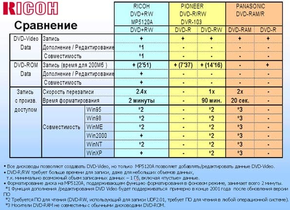 В начале февраля прошлого года произошло также событие, мало относящееся к технологиям записи CD-R/CD-RW дисков, но, тем не менее, важное как для компаний, работающих в сфере систем хранения информации на оптических носителях, так и для многих пользователей. В Японии наконец-то появились «живые» представители технологии DVD+RW устройств. Представляла же новую, давно ожидаемую разработку уже упомянутая выше группа компаний, состоящая из таких именитых производителей как Sony, Thomson Multimedia, Hewlett Packard, Mitsubishi Chemistry, Yamaha, Ricoh и Philips совместно разработала и продемонстрировала новый формат под названием DVD+RW. Все компании являются членами форума DVD, но до сих пор спорят по поводу единого стандарта. DVD+RW как раз и может стать тем стандартом, который способен объединить всех членов форума. DVD+RW совместим с уже выпускаемыми плеерами DVD, что позволит ему быстро получить признание. Члены DVD форума позиционируют новый фоpмат как «мостик между студиями на основе домашнего ПК и DVD проигрывателями». Стандарт DVD+RW имеет следующие преимущества: