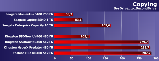 А что будет, если постараться избежать таких нежелательных ограничителей, как скорость одного из устройств в паре? Не стоит надеяться, что скорость копирования в пределах одного скоростного накопителя вдруг вырастет в разы — в этом случае сдерживающими факторами могут уже оказаться производительность процессора или, тем более, ограничения операционной системы. В итоге Toshiba OCZ RD400, который при потоковой записи данных одновременно с чтением (что как раз похоже на копирование внутри раздела) легко переваливал за 1,3 ГБ/с, при реальном копировании кучи разных файлов продемонстрировал лишь 25% от достигнутого ранее. В итоге он, конечно, все равно оказался самым быстрым из протестированных, но даже SSD с интерфейсом SATA обогнал всего вдвое. Ну а медленный SSD (причем даже не самый медленный), как видим, может отстать в этом тесте и от лучших винчестеров. Понятно, что это сильно упрощенный сценарий использования, а покупают эти накопители совсем для другого, однако не стоит удивляться итогам. Скорость последовательной записи у этих накопителей невысока, превысить ее в принципе могут уже и некоторые модели портативных внешних винчестеров, что наверняка будет шоком для владельца: он купил быстрый (в целом) накопитель, а скорость копирования вдруг упала :)