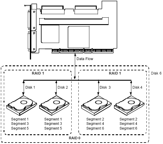 RAID10. Число дисков, организующих массив, должно составлять от 4 до 30 и обязано быть кратным двум. Последнее условие налагается в связи с тем, что первоначально каждые два диска объединяются в RAID1 массив, а потом создается RAID0 массив RAID1 массивов (страйп зеркал). Наглядно структуру массива можно видеть ниже (иллюстрация из руководства пользователя контроллера MegaRAID 320-2):