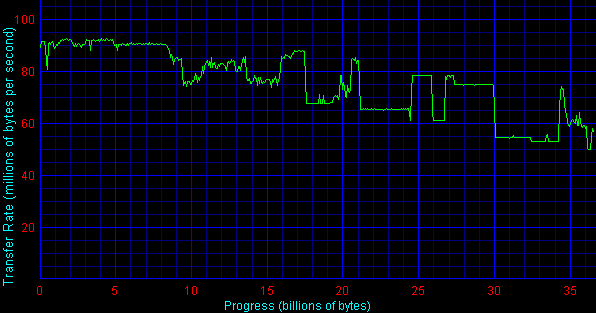 График линейного чтения для RAID1 имеет конкретно инопланетную природу, причем из мира с абсолютно другими законами физики. Попытки повторить эксперимент и получить подобный график во второй раз не увенчались успехом — график получался столь же лунным, но скачки и провалы располагались абсолютно произвольно.