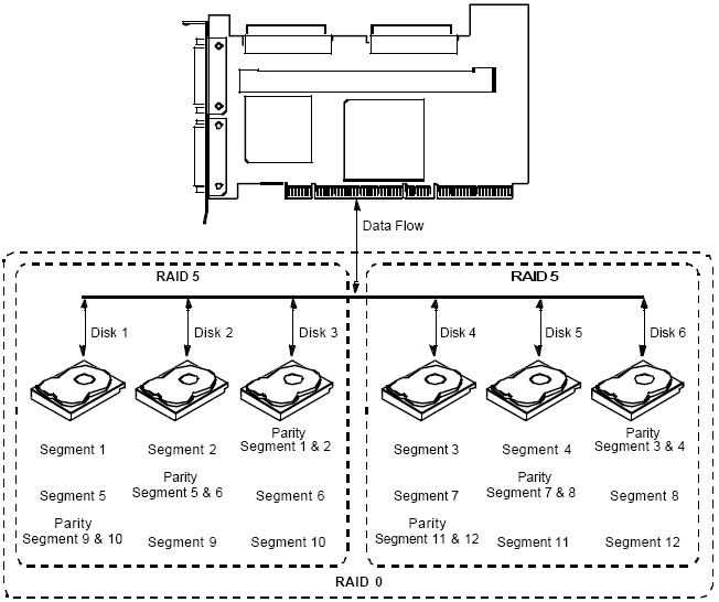 RAID50. Массив может быть организован на дисках количеством от 6 до 30. Внутренняя организация подобна RAID10 и представляет собой страйп массивов RAID5. Рисунок ниже иллюстрирует принцип построения такого массива.