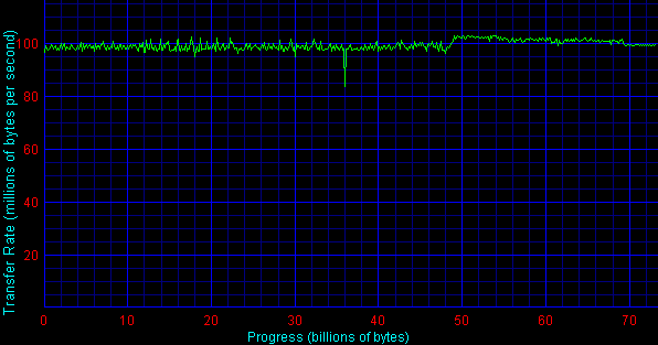 Экзотика на первом графике и оригинальные результаты на втором. На графике для массива RAID0 линейная скорость чтения колеблется в пределах от 95MB/sec до 105MB/sec (а также провал до 83MB/sec прямо посередине). Это не очень согласуется с тем, что можно было бы предположить. Если считать, что, например, первый сегмент пишется в начало первого диска, второй — в конец второго, третий — после первого сегмента на первом диске, четвертый — перед последним сегментом на втором и т. д., то тогда теоретический максимум скорости линейного чтения (чтение происходит в аналогичном порядке) может достигать 130 — 135MB/sec, а минимум не должен быть ниже 120-125MB/sec. При другой реализации порядка записи сегментов на диски, например, первый сегмент — в начало первого диска, второй — в начало второго, третий — после первого на первый диск, четвертый — после первого на второй и т. д., теоретический максимум составит 150MB/sec, минимум — 100MB/sec. Естественно, всегда надо иметь в виду, что теоретическое значение в мире высоких технологий практически не достижимо, но и откровенные несоответствия тоже наблюдаются редко. В разделе Intel IOMeter у нас будет возможность сравнить полученный график с результатами теста «sequential read».