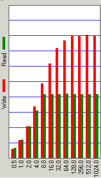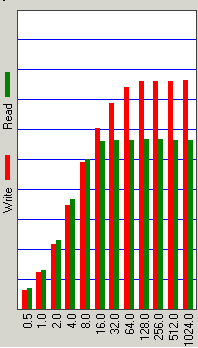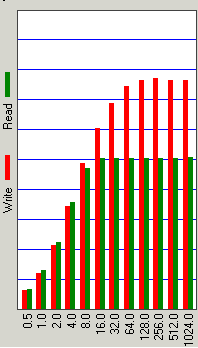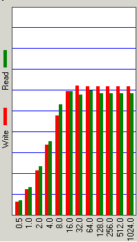 «Чехарда» со скоростью чтения и записи в зависимости от размера блока на тестовых файлах размером вплоть до 512 Кбайт (тут показана ситуация для файла 128 Кбайт, но для 256 и 512 ситуация примерно та же) для новичка немного улучшилась (особенно это заметно для записи), хотя, к сожалению, не исчезла совсем. Немного повысилась и скорость работы с самыми мелкими блоками (512 и 1024 байт), хотя до идеала все еще далеко. Начиная с тестовых файлов 1 Мбайт картинка по чтению и записи немного «выпрямляется», хотя тут же обнаруживается, что кэширование чтения практически пропало, причем скорость чтения падает ниже скорости физического носителя (не исключено, что это последствия неблагоприятной интерференции метода измерения, примененного в данном тесте, с «интеллектуальными» алгоритмами работы firmware накопителей Maxtor, хотя полученные на домегабайтных тестовых файлах картинки на удивление повторяемы и однотипны для разных дисков). Впрочем, по чтению ситуацию может замтено улучшить применение NCQ в SATA-моделях этой серии. Что же касается записи, что и на крупных тестовых файлах она явно улучшилась в плане кэширования буфером — крупные файлы эффективно кэшируются (практически до скорости интерфейса) вплоть до размеров 8 Мбайт (!), что было немыслимо для всех предыдущих поколений ATA-дисков этого и других производителей. Maxtor можно поздравить со взятием еще одного «бастиона». :)