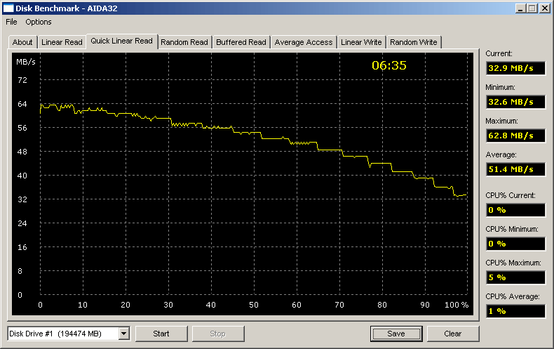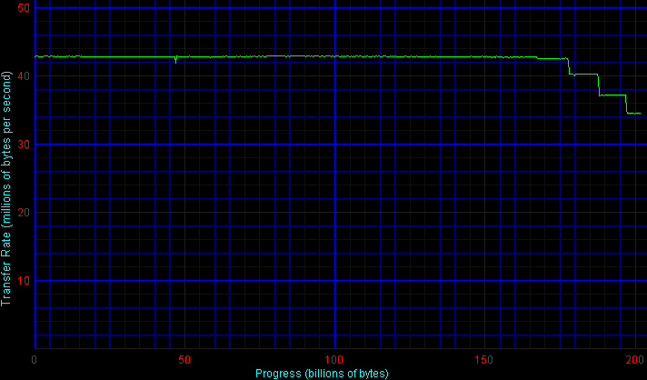 Как видите, для случаев SBE, FW800 по USB и FW по 1394а через «наплатный» чип TI графики представляют собой практически прямые линии, расположенные существенно ниже заявленных производителем потолочных 34 МБ/ c для USB и 41 МБ/ c для 1394а — провал последнего особенно заметен. «Скучность» графиков объясняется только одним — возможностей интерфейсной шины просто не хватает для реализации скоростного потенциала замурованного в корпус винчестера. При подключении по 1394а через PCI-плату на чипе NEC картина более благостная — и средняя скорость соответствует заявленной и на последнем участке. Но только 1394b проливает бальзам на душу — именно такой и должна быть нормальная ситуация с подключением внешнего винчестера! По сути, мы видим не что иное, как график внутренней скорости чтения с поверхности диска. Так что решение использовать 1394b-интерфейс следует признать более чем оправданным, а его воплощение в железе — вполне удачным. Более того, такой внешний интерфейс оказался даже «шире», чем требовалось собственно диску. Впрочем, запас карман не тянет.