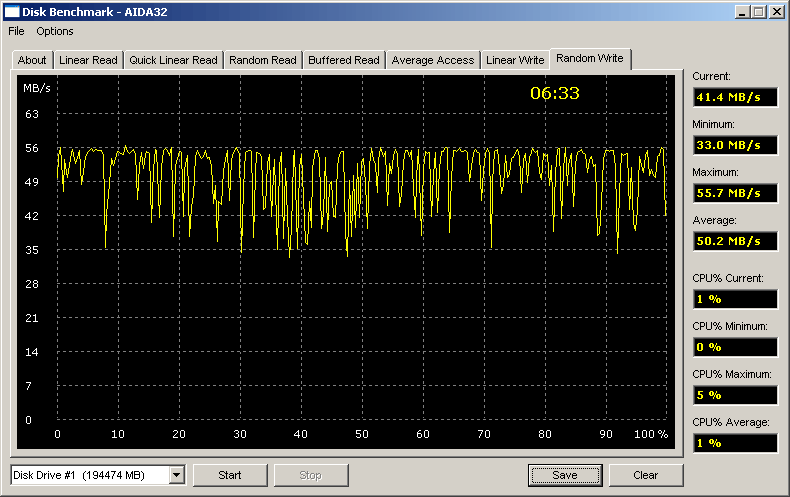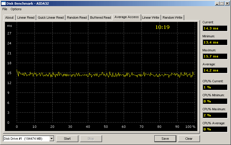 Очевидно, что среднее время поиска у внешнего диска немного страдает только для варианта SBE, а кэширование во всех вариантах подключения внешних накопителей настолько эффективно, что средний показатель случайного чтения в тесте AIDA32 практически не уступает таковому для линейного (упорядоченного) чтения, а при записи даже немножко превосходит таковой для линейного доступа!
