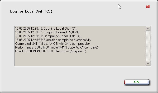 По окончании процедуры резервного копирования выдается отчет о проделанной работе (рис. 9). Как видите, резервирование диска С: с 4,5-Гбайтным содержимым заняло без малого 20 минут, что дает 8,34 Мбайта/ c — не самый рекордный показатель.