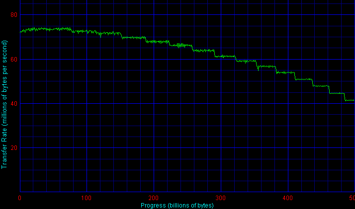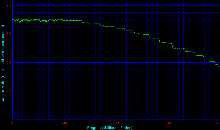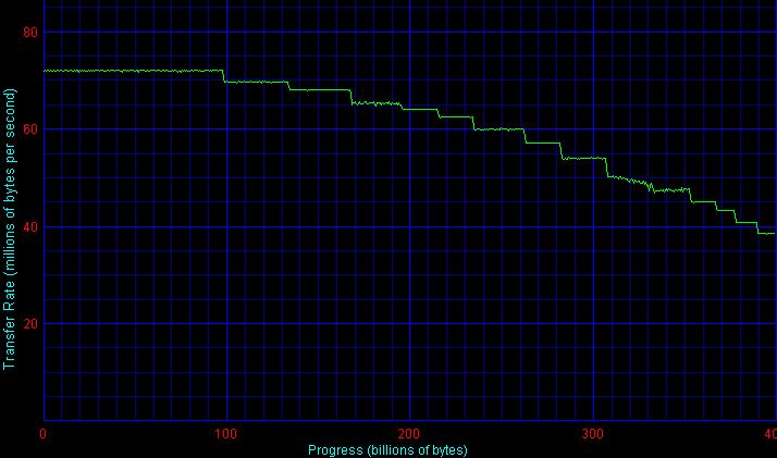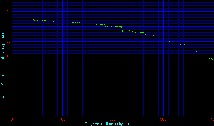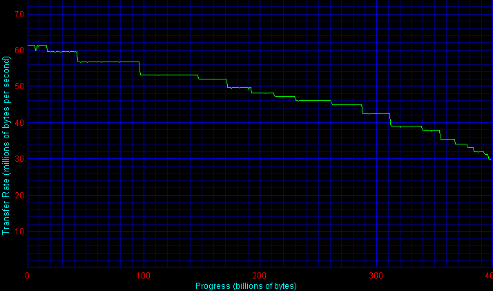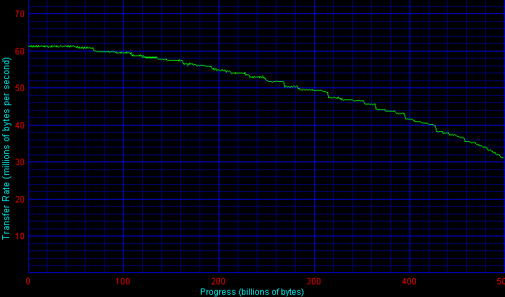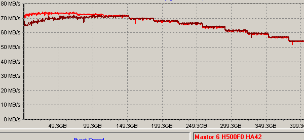 В утешение можно лишь отметить, что Макстору данный шаг не дался легко: график для диска 6H500F0 куда менее «твердый» (гладкий и воспроизводимый), чем у 6B300S0, и особенно падение скорости линейного доступа относительно максимально возможных (идеальных) значений заметно на наиболее быстром внешнем участке пластин. При записи эффект не совсем уверенного захвата внешних дорожек для этого диска еще более заметен, (см. следующий скриншот HD Tach 3.0.1.0).