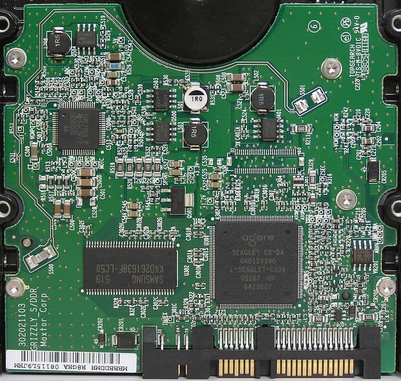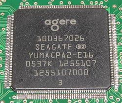 Обратим внимание, что контроллеры обоих фигурантов используют схожие процессоры (SoC) от одного производителя: чип Agere Seaglet C3-D4 установлен в продукте Maxtor, а Agere YUMACPA2-E16 на диске Seagate. Впрочем, в декабре 2006 года компанию Agere Systems приобрела знаменитая LSI Logic, что может позднее отразиться на выборе контроллеров для накопителей Seagate. Платы контроллеров этих двух дисков (кликните по последним картинкам, чтобы посмотреть их в большем разрешении) с обратной стороны не содержат никаких радиоэлементов (см., например, плату ST3500641AS с обратной стороны), то есть SoC для Seagate уже оснащен встроенной кэш-памятью на 16 Мбайт (префикс E16 в обозначении; для младших барракуд 7200.9 используется тот же контроллер с префиксом E8), тогда как диск Maxtor использует для этого отдельную микросхему. Подобный подход для Seagate, к слову, начала практиковать именно с рассматриваемой серии.
