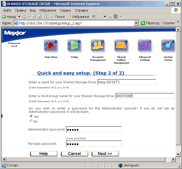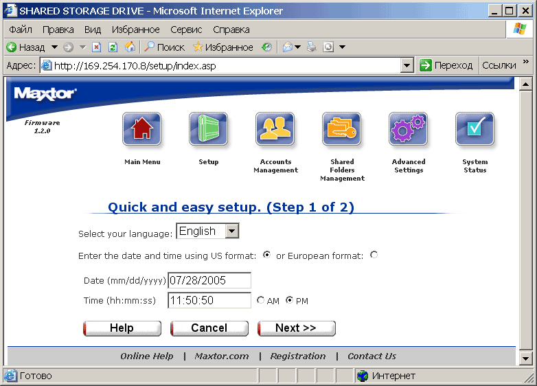 Начав по порядку с Run Setup Wizard получаем возможность настроить язык (о русском забудьте), дату и время в привычном нашей местности формате, название и рабочую группу (кириллица вновь за бортом) для сетевого винчестера, а также пароль администратора (см. скриншоты).
