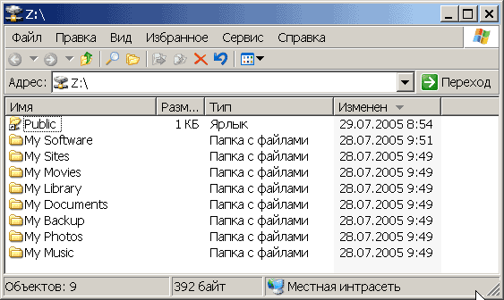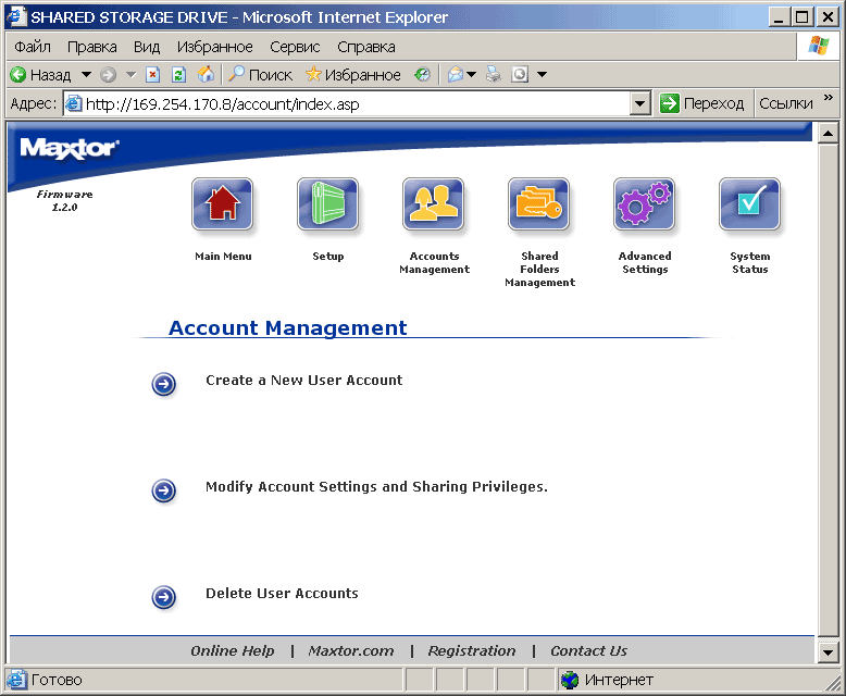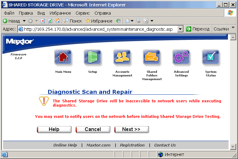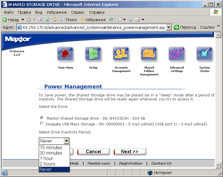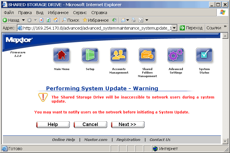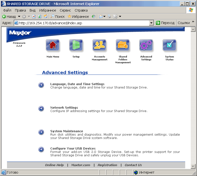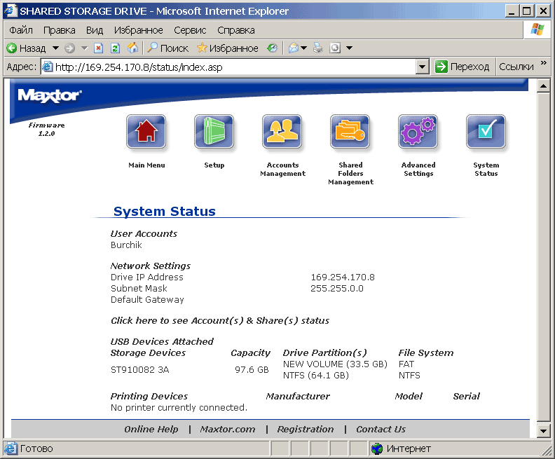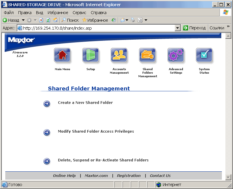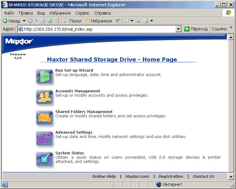 Пункт System Status отображает текущее состояние дел в системе. В системе накопитель H01P200 видится как компьютер (по умолчанию в составе рабочей группы Mshome) с некоторым количеством расшаренных папок (см. рисунок). Соответственно, все манипуляции с файлами могут осуществляться стандартным проводником Windows или тем файловым менеджером, который вы предпочитаете. При этом возникает чувство национальной неполноценности — с русским языком в названиях папок и файлов сетевой Maxtor обращается играючи. Так, например, на вставленной в него флешке он уже видит их «кракозябрами», при копировании на флешку русскоязычных файлов они вроде бы отображаются с оригинальными названиями, однако потом, при подключении к USB-порту нормального компьютера обнаруживается, что в действительности их названия искажены. Выражаем уверенность, что в последующих прошивках это безобразие будет каким-либо образом упразднено.