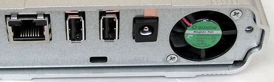 На заднем торце находятся разъёмы: питания, два «хостовых» USB и один Ethernet, выдувающий вентилятор,
