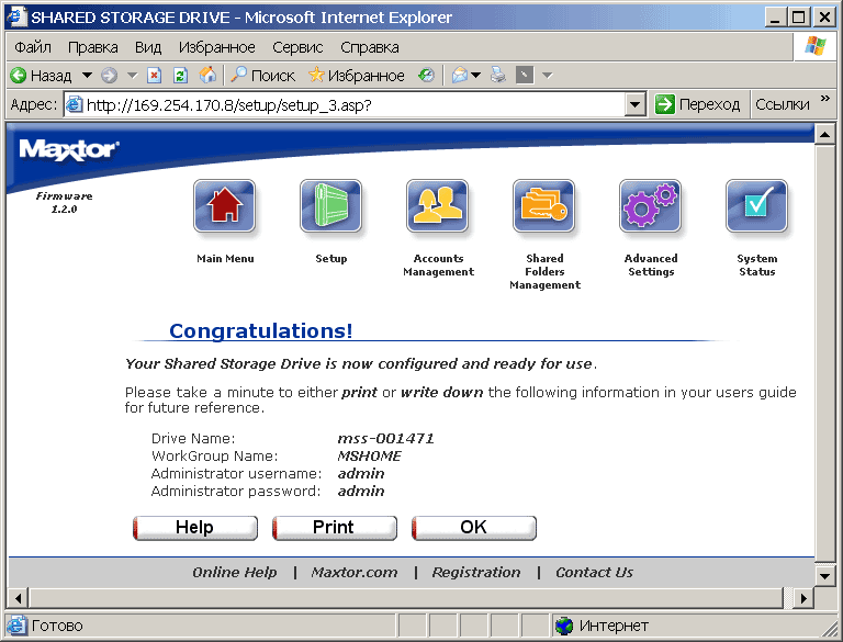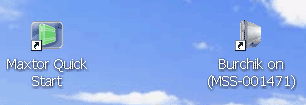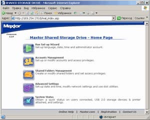 Для начала работы с H01P200 после его присоединения к локальной сети и включения питания потребуется установить с Quick Start CD управляющую утилиту. После этого на рабочем столе появляются два ярлыка Maxtor Quick Start для управления сетевым винчестером и ссылка на сам H01P200 (см. рис.).
