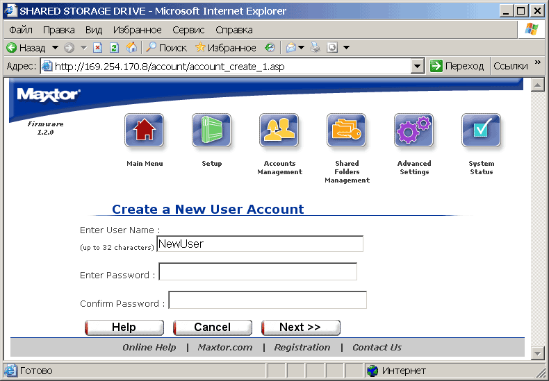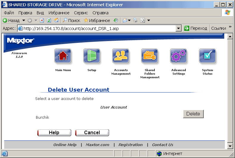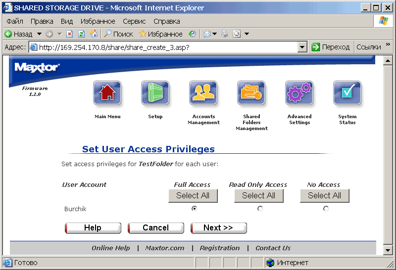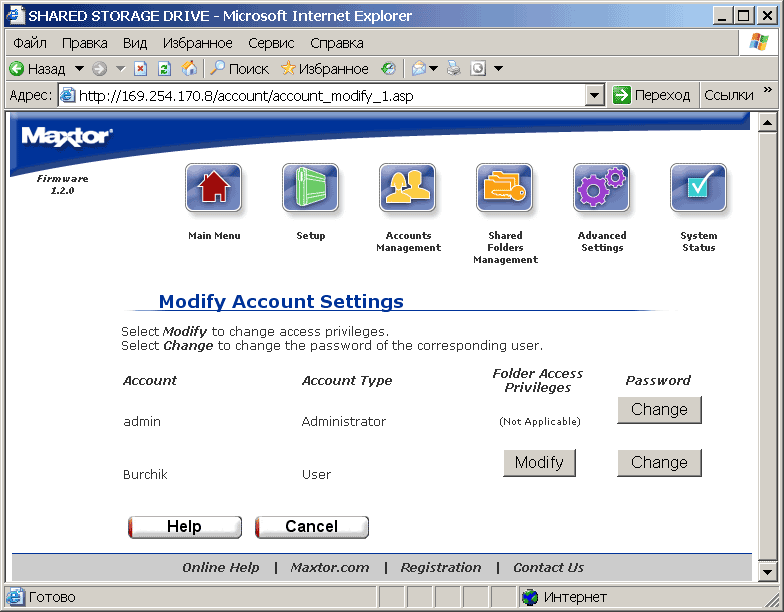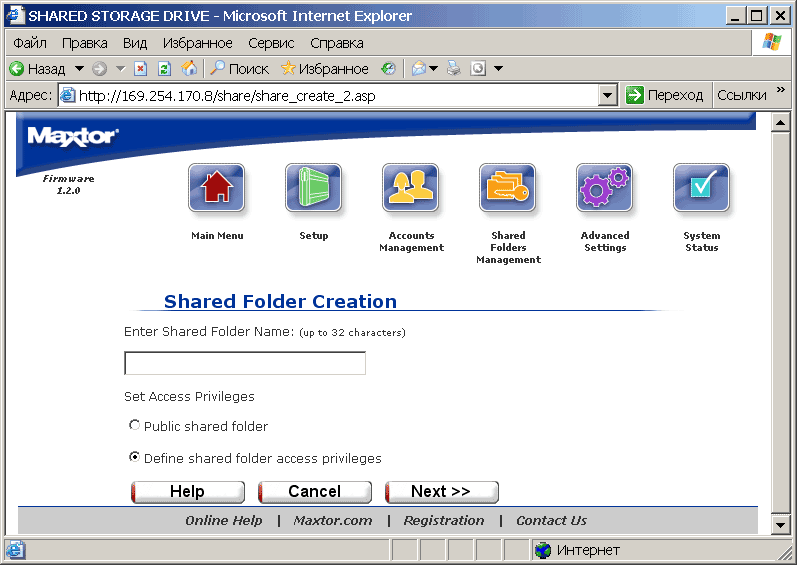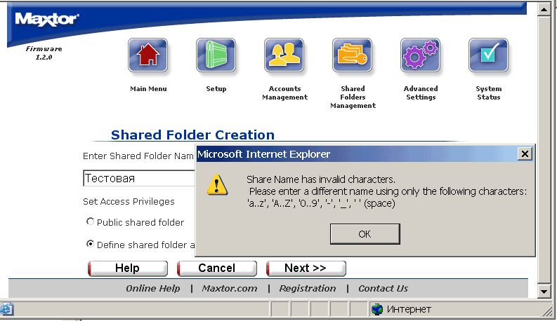 служат, соответственно, для создания и управления пользовательскими аккаунтами и для создания и управления папок и правами доступа к ним. При этом максимальное число таких папок составляет 179, что связано с ограничениями ОС Linux, установленной на Maxtor'е. На кириллице же опять спотычка: