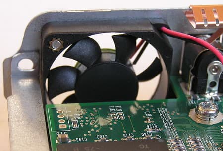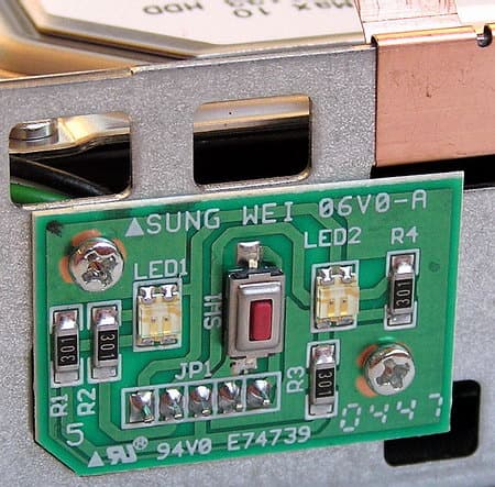 На переднем торце «внутренностей» корпуса расположена небольшая платка с кнопкой управления и двумя сетодиодами — постоянный или мигающий зеленый и желтый свет помогает различать нормальное функционирование, включение/выключение и проблемы с сетевым интерфейсом.