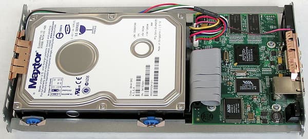 Помимо жесткого диска Maxtor DiamondMax 10 с интерфейсом UltraATA/133 (в данном случае — модель 6B200P0 объемом 200 Гбайт с буфером 8 Мбайт), закрепленного на жеском металлическом каркасе при помощи амортизирующих прокладок с медными контактными группами,
