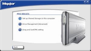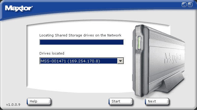 Выбрав Maxtor Quick Start мы попадаем в первый экран утилиты. Здесь выясняем, что сетевой накопитель с Network ID MSS-001471 действительно присутствует в сети по IP адресу 169.254.170.8 и мы можем приступить к манипуляциям с ним (см. рисунок).
