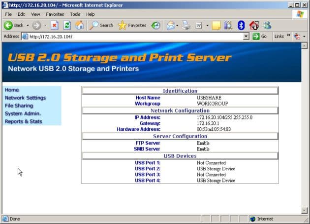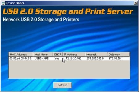 Уже через десять секунд после подключения питания (отметим, что отдельного выключателя нет) устройства оно полностью готово к работе. Первым шагом при настройке является выяснение IP адреса устройства (по умолчанию и после полного сброса он автоматически устанавливается через DHCP). Для этого можно использовать идущую в комплекте утилиту Devfinder или просто использовать для доступа имя хоста (по молчанию — USBSHARE).