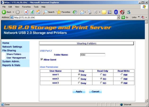 Для работы доступны разделы на подключенных дисках и флеш-драйвах, отформатированные в FAT (интересно, что в первой версии прошивки поддерживалось и чтение NTFS). Каждому порту можно назначить свое имя сетевого ресурса. Если же на данном диске не один раздел, а несколько, то второй и последующие разделы автоматически именуются с суффиксами «_2», «_3» по номерам разделов (если раздел не распознается устройством, то его номер пропускается). Для каждого порта (отметим, что именно порта, а не раздела) можно задать свои правила доступа для конкретных пользователей: «нет доступа», «только чтение» и «чтение и запись». Кроме того, можно разрешить или запретить гостевой доступ (если он разрешен, то гости имеют полный доступ к папке). Управление пользователями сводиться просто к ведению списка «имя-пароль». Объединять в группы пользователей нельзя. Администратор устройства имеет полный доступ ко всем папкам.
