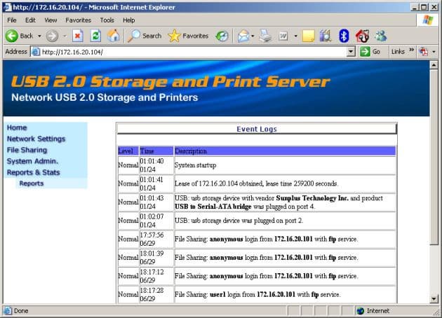 Сервер ведет и не очень подробный лог событий. В него в частности записываются события включения устройства, подключения USB устройств, настройки сети (DHCP), подключения пользователей через FTP. Вход администратора в web-интерфейс не записывается в логфайл.