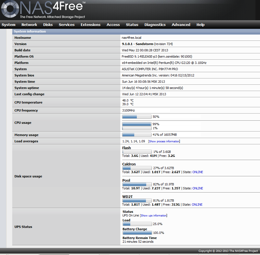 UPD: FreeNAS 9. Совсем недавно, 5 августа 2013 г., выпущен релиз FreeNAS 9.1.0, а 27 августа — содержащий коррекции ошибок релиз 9.1.1 Новая версия использует FreeBSD 9-Stable и, по мнению разработчика, содержит значительные улучшения в области стабильности, расширяемости, простоты использования и производительности. Мы планируем протестировать производительность в 3-й части статьи. Аппаратные требования FreeNAS 9.x по сравнению с FreeNAS 8.x не изменились.