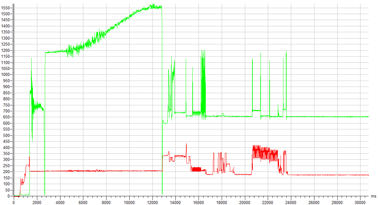 К конце раздела приведем графики потребления по шинам в момент запуска жесткого диска при подаче на него питания. Зеленой линией обозначено потребление по шине 12 В, а красной — по шине 5 В. Задержка включения составляла 250 мс, а общий интервал записи — 30 секунд. По горизонтальной оси — время в миллисекундах, по вертикальной — ток в миллиамперах.