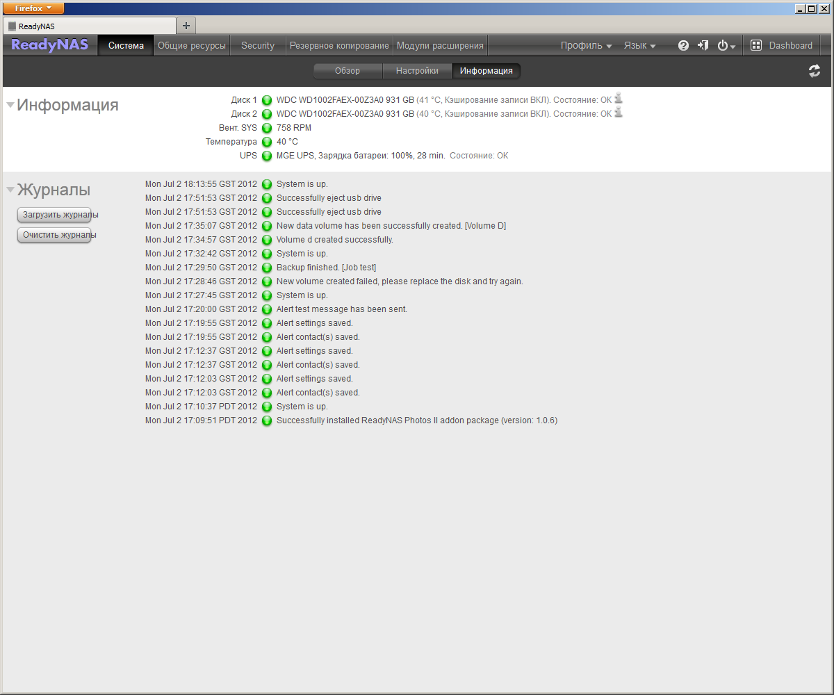 Третья страница, названная «Информация», содержит данные о названиях, состоянии, температуре и данных S.M.A.R.T. жестких дисков, повторяет данные по вентилятору и системной температуре, а также содержит журнал работы накопителя. Кстати, при выборе пункта его загрузки, в реальности вы получаете не только копию информации с экрана, но и несколько десятков системных отчетов встроенного Linux.
