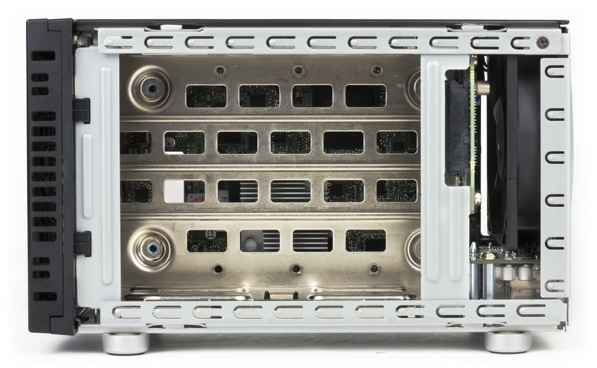 Как и у прошлых поколений, основой модели служит металлический каркас. Внутри пользователю обычно делать нечего, поскольку диски устанавливаются снаружи. Но при желании заглянуть туда можно. Например, для очистки вентилятора от пыли. Правда надо быть готовым к долгой работе отверткой — винтов в конструкции очень много.