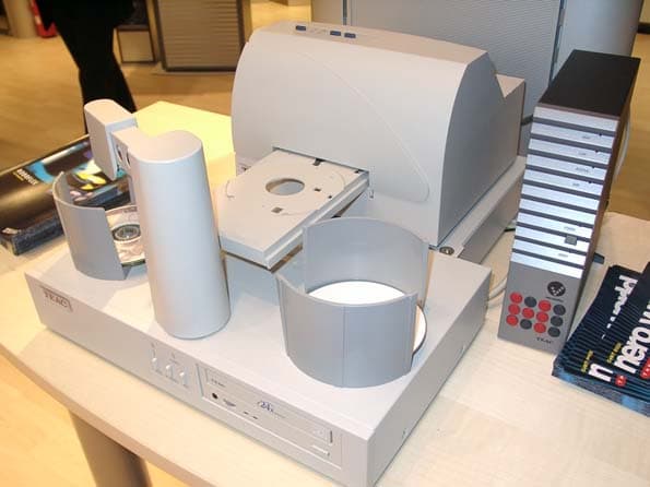 Компания TEAC на своем стенде предлагала посетителям выставки понаблюдать за работой автоматизированного комплекса-дубликатора дисков Roboflex. Следить за его работой было весьма интересно. Вам лишь необходимо положить в лоток стопочку CD-R с нерабочей поверхностью, пригодной для нанесения рисунков, и дать задание на размножение ваших данных. Все остальное робот сделает за вас. Вам только надо успевать забирать готовые, записанные и «покрашенные» диски, и пополнять лоток чистыми CD-R.