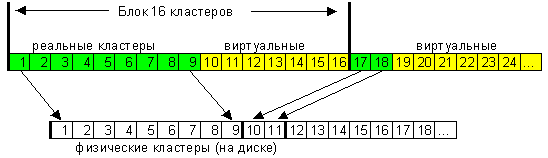 Видно, что сжатый файл имеет «виртуальные» кластеры, реальной информации в которых нет. Как только система видит такие виртуальные кластеры, она тут же понимает, что данные предыдущего блока, кратного 16-ти, должны быть разжаты, а получившиеся данные как раз заполнят виртуальные кластеры — вот, по сути, и весь алгоритм.