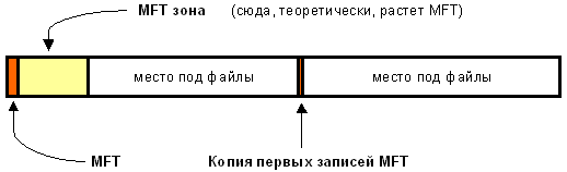 Диск NTFS условно делится на две части. Первые 12% диска отводятся под так называемую MFT зону — пространство, в которое растет метафайл MFT (об этом ниже). Запись каких-либо данных в эту область невозможна. MFT-зона всегда держится пустой — это делается для того, чтобы самый главный, служебный файл (MFT) не фрагментировался при своем росте. Остальные 88% диска представляют собой обычное пространство для хранения файлов.