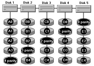 На рисунке изображен массив из пяти дисков. Видно, что каждый диск хранит четыре (условные) части реальных данных и один блок данных четности. Блок четности — скажем, 0 parity — способен восстановить потерю одного из фрагментов — любого, но одного — среди A0, B0, C0 и D0. Все вместе они, в свою очередь, способны восстановить блок 0 parity. Из изображенной структуры RAID видно, что данные, необходимые для полного восстановления всего столбика — то есть информации любого диска в случае сбоя — находятся на других дисках. В этом и заключается восстановление — при записи данных на любой из дисков обновляется также блок четности другого диска, соответствующего текущему блоку (например, при записи в A2 обновляется еще и блок 2 parity). Чтение данных с исправного диска происходит без использования блоков четности, т. е. почти в том же режиме, в каком работает RAID 0. Быстродействие RAID 5 в том виде, в каком это реализовано в NT, даже немного выше, чем у RAID 0.