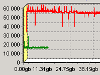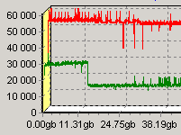 Здесь налицо, что называется, оба признака. Но и это еще не все. Похоже на то, что диски Maxtor DiamondMax Plus 9 производят однократную проверку каждого сектора при первой записи в него, причем этот факт нигде не указан! Это видно, например, если прервать выполнение теста HDTach и запустить его снова.