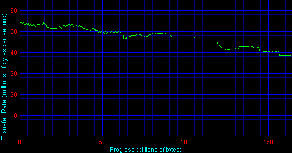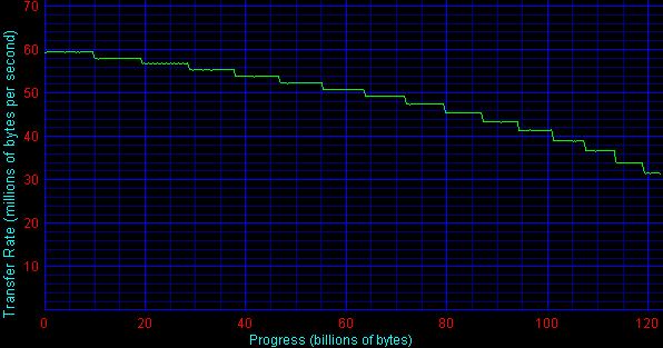 График чтения Maxtor 6Y160P0 поражает оригинальностью — такого я давно не видел :). Странный вид графика Samsung объясняется применением фирменной технологии «эластичная BPI» (Bits per inch, линейная плотность записи).