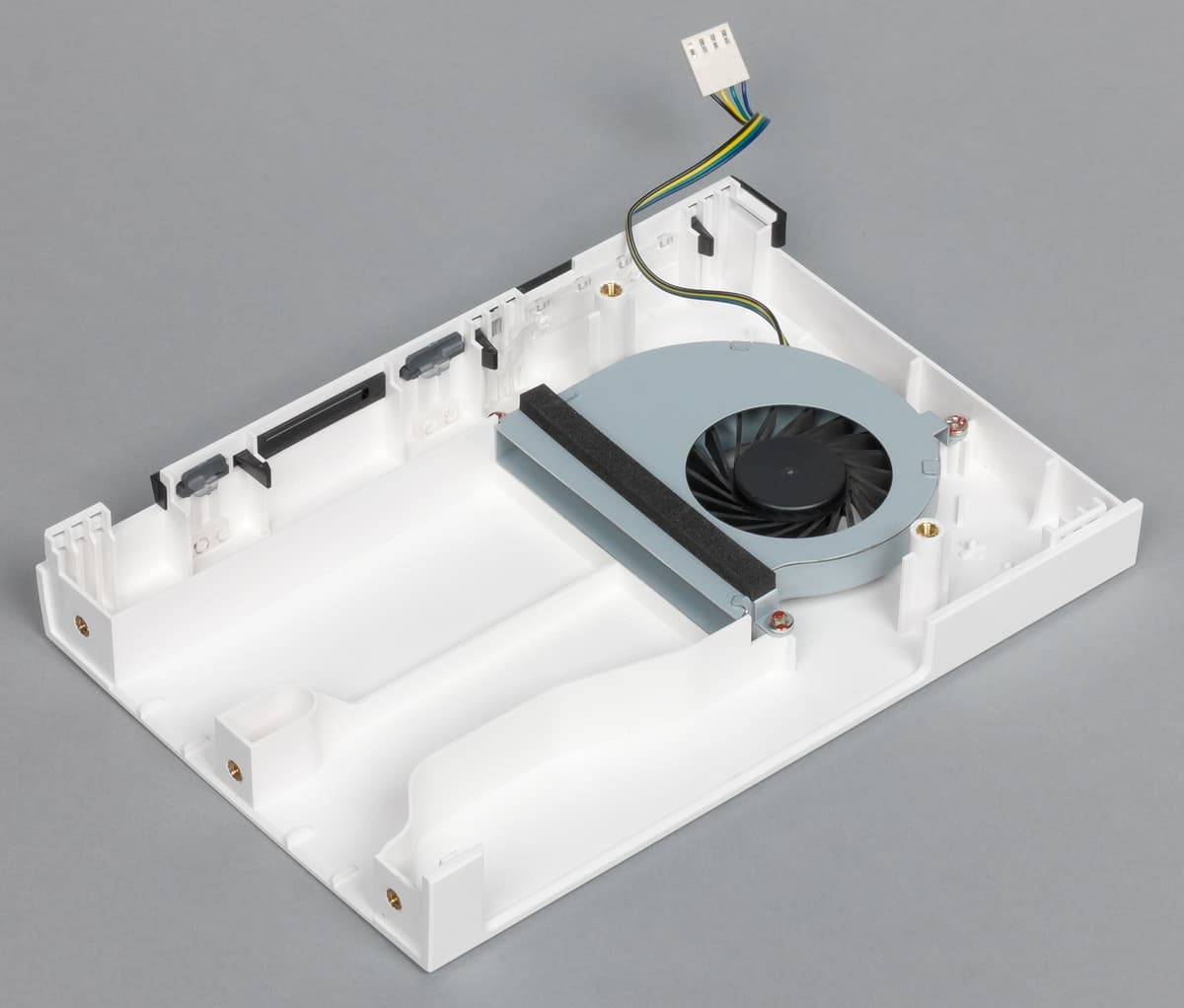 Вентилятор представляет собой центробежную модель с диаметром крыльчатки около 40 мм, оборудованную четырехпроводным подключением. Уровень шума устройства во время работы невысокий, так что эту модель можно использовать в жилом помещении и около телевизора. Правда, на странице статуса фигурируют цифры более 1000 об/мин, что несколько странно, учитывая что мы тестировали накопитель с не отличающимся горячим нравом диском WD Red. К сожалению, разборка корпуса не является простым занятием. Так что желательно не использовать устройство в пыльной обстановке.