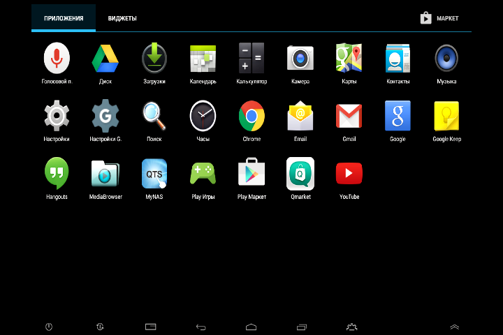 В устройстве используется версия Android 4.4.4. Из дополнительных программ предустановлены медиаплеер Media Browser, ссылка на веб-интерфейс накопителя MyNAS, магазин приложений Qmarket (Google Play тоже присутствует). Также надо отметить собственную версию модуля «Настройки», в котором представлены параметры сетевого порта и видеовыхода. Очень впечатляюще выглядит вкладка «Память» с почти полным объемом установленного жесткого диска. Отметим, что обе операционные системы имеют доступ к одному и тому же пространству для хранения файлов, что достаточно удобно.