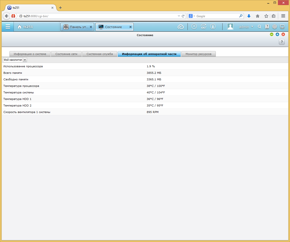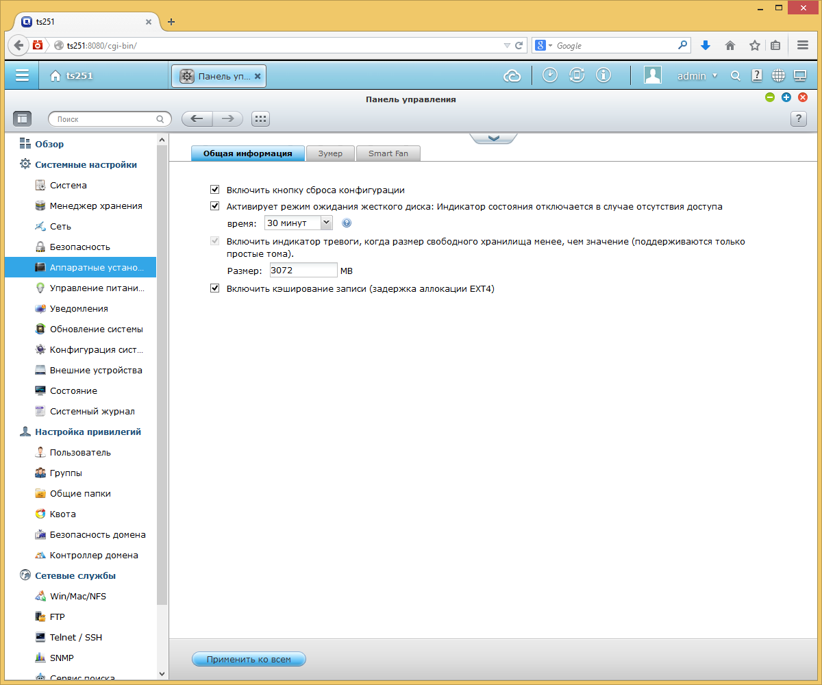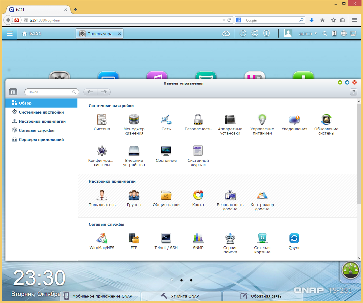 Настройки устройства собраны в панели управления. Из ее меню также вызываются некоторые отдельные модули, в частности менеджер хранения и резервное копирование. Это может первое время немного путать, но привыкнуть несложно.