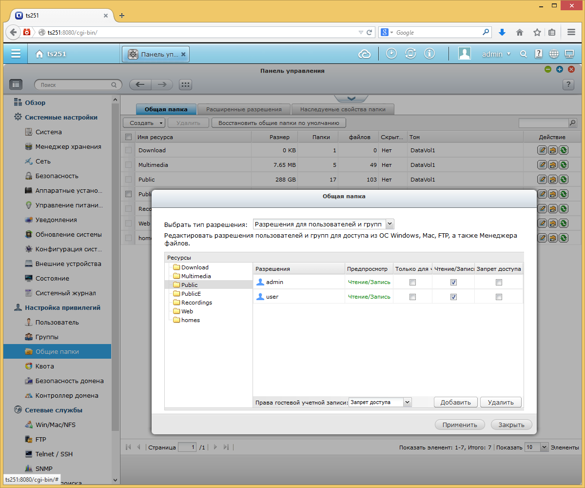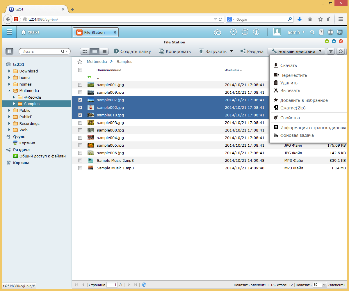 В базовую прошивку, кроме описанного модуля myQNAPcloud, входит и программа File Station. Она представляет собой многофункциональный менеджер файлов, работающий в браузере. В нем можно осуществлять любые операции с файлами и папками на устройстве, в том числе загружать и скачивать, копировать и удалять. Предусмотрен доступ к корзине удаленных данных и управление раздачей файлов по прямым ссылкам. Последняя возможность позволяет легко и просто передать файл практически любого размера друзьям и знакомым (потребуется иметь внешний/«белый» IP-адрес на роутере и настроенную трансляцию портов).