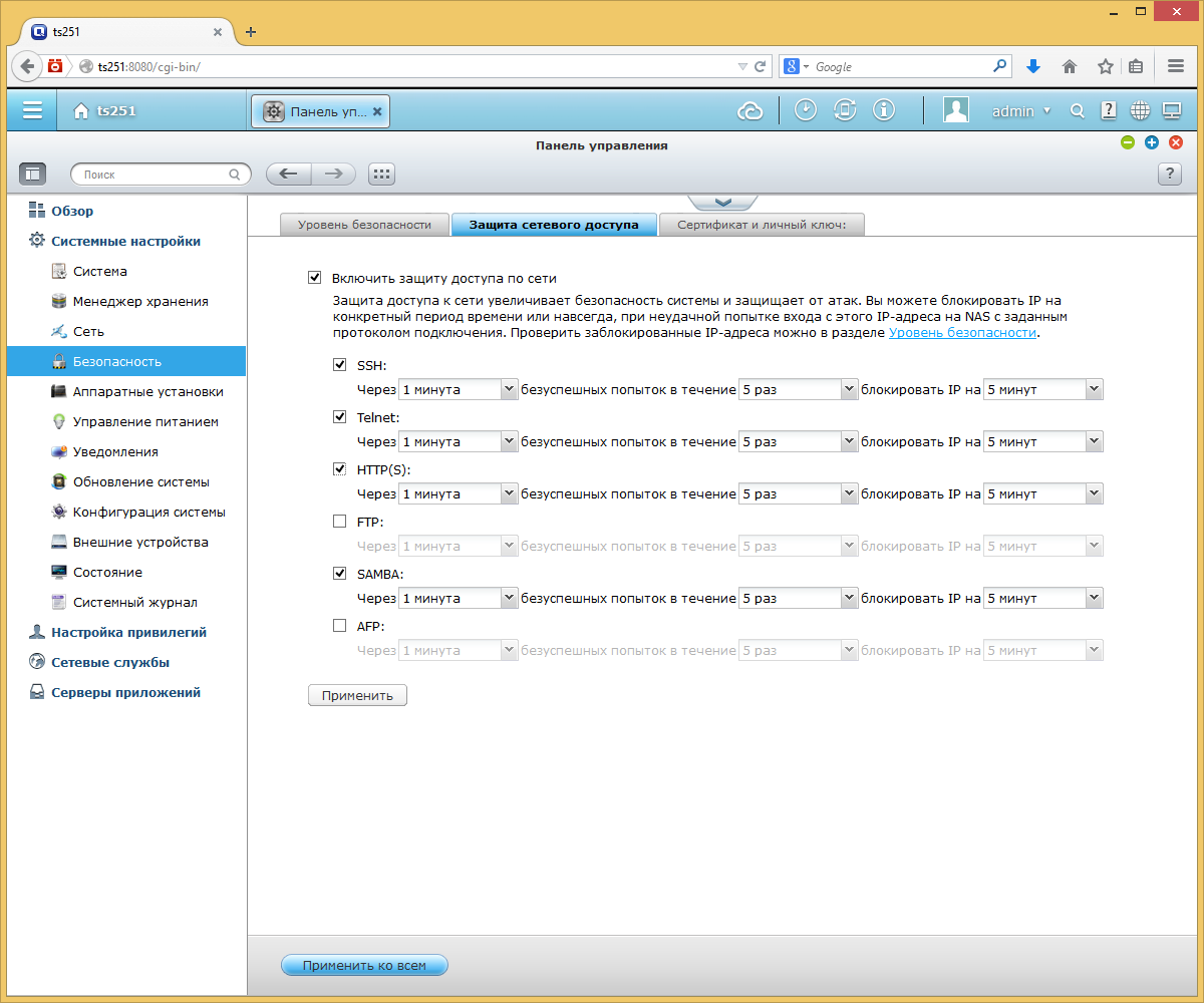 Предусмотрено ограничение прав пользователей на протоколы и сервисы. Например, можно запретить доступ через FTP и разрешить через WebDAV. На отдельной странице можно указать обязательные требования к сложности паролей пользователей. Дополнительно система позволяет установить дисковые квоты для пользователей. На отдельных страницах можно запрограммировать права для протоколов NFS и WebDAV, а также ограничить клиентов по их IP-адресам. Отметим, что возможно управление не только правами к самим ресурсам, но и установка ограничений на папки и файлы в них с использованием Windows ACL.