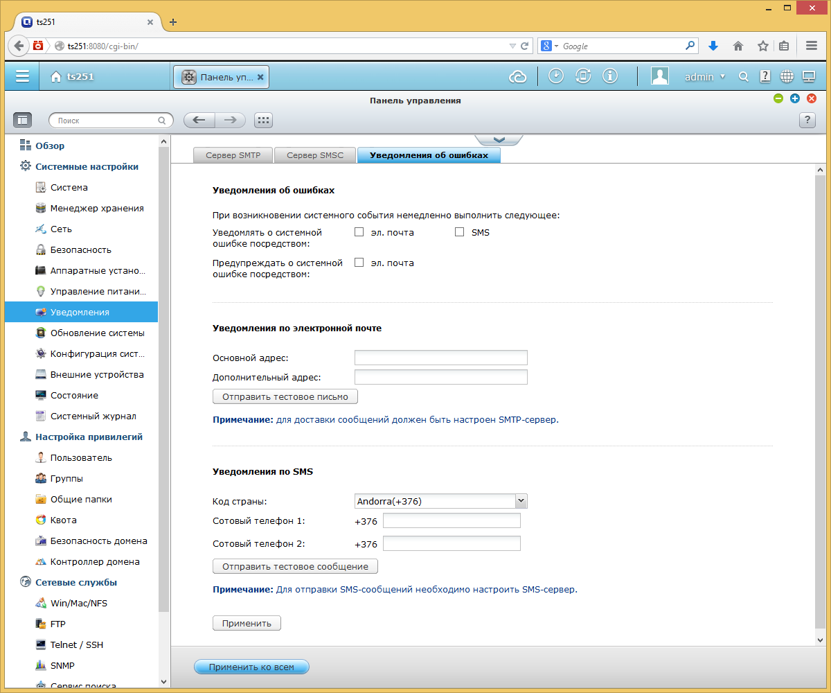 Для уведомления пользователя о событиях на сетевом накопителе используются электронная почта или SMS. В первом случае надо указать параметры сервера для отправки сообщений, а во втором — настроить удаленный сервис. Всего можно указать до двух получателей для каждого канала связи.