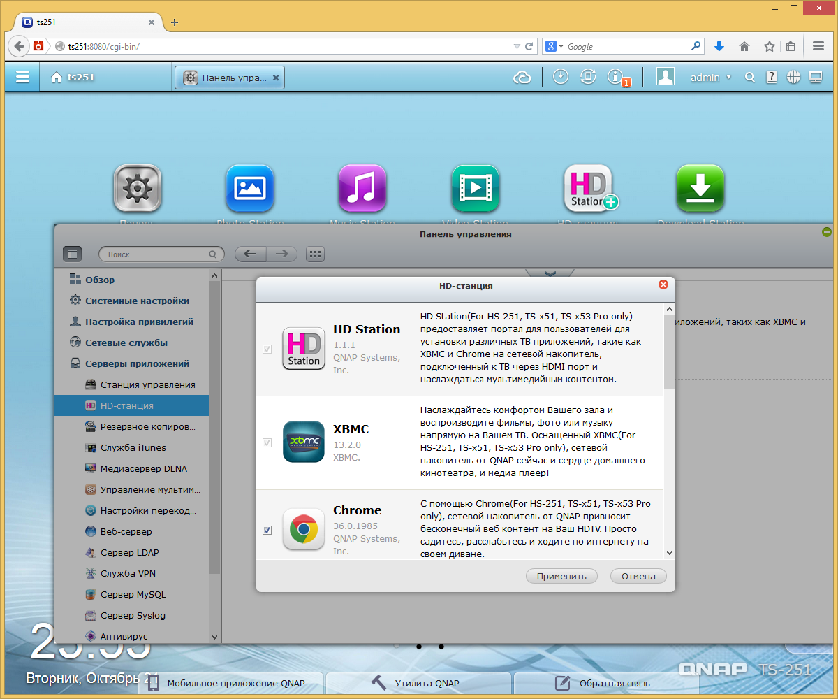 На момент написания статьи в нем присутствовали следующие программы: браузер Google Chrome, пакет CodexPack для использования встроенных в процессор модулей декодирования и кодирования видео (только для серий накопителей x51 и x53) , пакет для локальной работы с Surveillance Station, программа-медиацентр XBMC, клиент YouTube, пакет для доступа к веб-интерфейсу администрирования накопителя, TuneItRadio для прослушивания интернет-радиостанций и музыкальный каталог Spotify (не работает у нас).