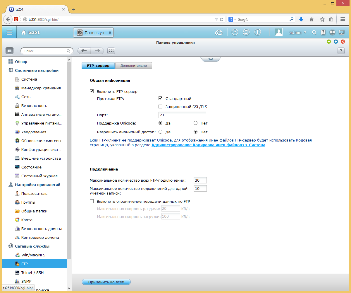 Для доступа к документам поддерживаются протоколы SMB, AFP, NFS, FTP и WebDAV. У сервера FTP традиционно очень гибкие настройки. Он поддерживает шифрование и пассивный режим. Есть возможность изменить номера портов, ограничить число подключений и скорости.