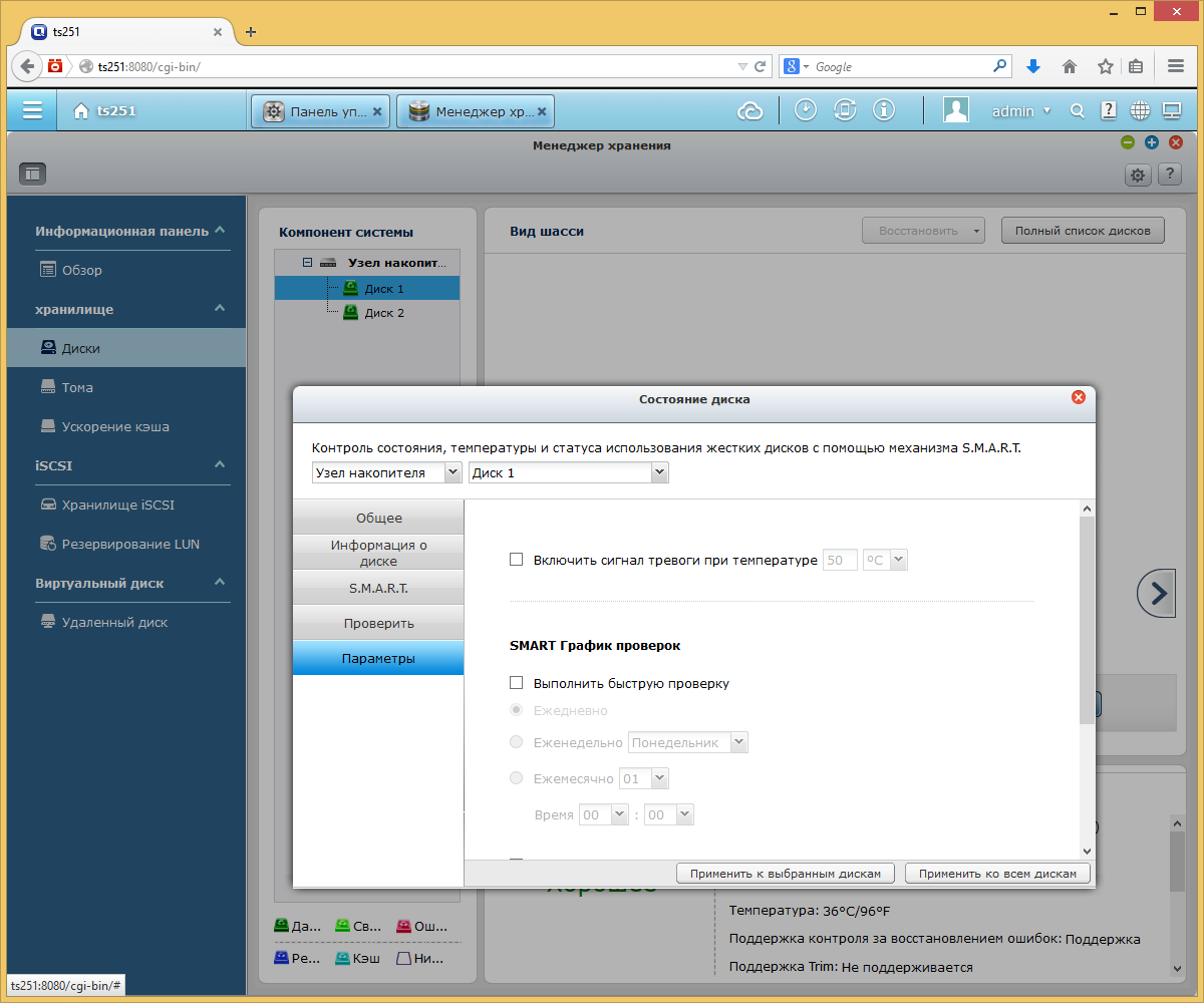 Для контроля состояния дисков пользователь может запрограммировать расписание проверок по технологии S.M.A.R.T. и оповещение при превышении температуры.