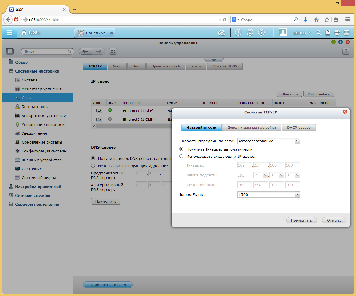 Для подключения к сети предусмотрено два гигабитных порта, которые могут работать в различных режимах резервирования и балансировки нагрузки. Возможно также использование подключаемых в порт USB беспроводных адаптеров. В дополнение к традиционному IPv4 устройство поддерживает протокол IPv6, имеет встроенный клиент DDNS и возможность использования прокси-сервера для выхода в сеть самим накопителем. Дополнительно предусмотрена настройка привязки сетевых служб к конкретным адаптерам, что может быть полезно для повышения безопасности.