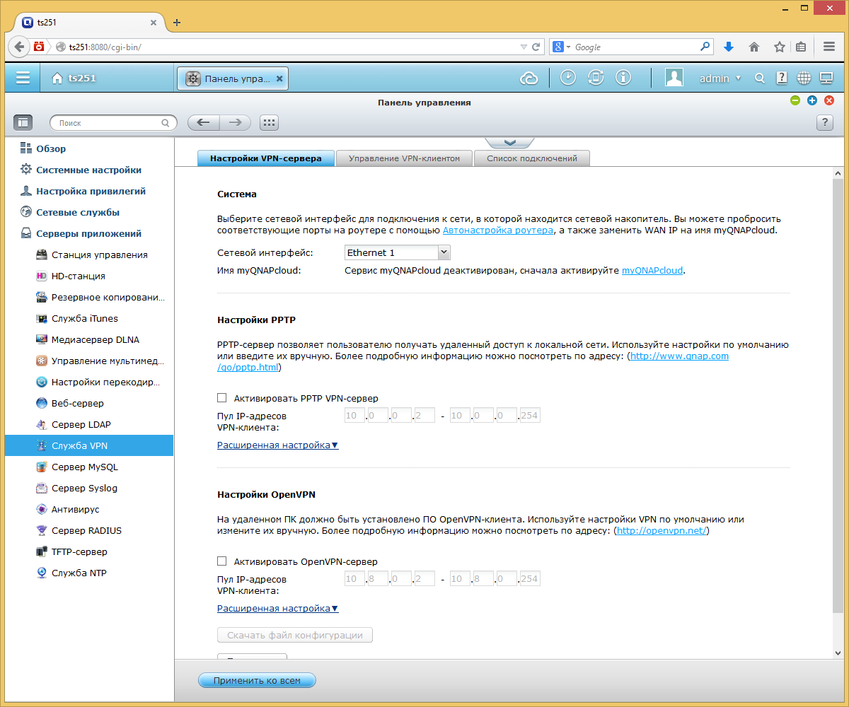 Компания особое внимание уделяет реализации удаленного доступа к сетевому накопителю. Набор соответствующих функций даже вынесен в отдельную группу, названную myQNAPcloud. Традиционным способом обеспечения удаленного доступа (при наличии внешнего адреса на роутере) является сочетание сервиса DDNS и настройки правил трансляции портов на домашнем маршрутизаторе. В качестве варианта упрощения в данном случае используется собственный сервис динамического DNS и протокол UPnP для открытия портов на роутере. Дополнительно можно использовать встроенный в накопитель сервер VPN для получения безопасного доступа ко всему сегменту локальной сети.