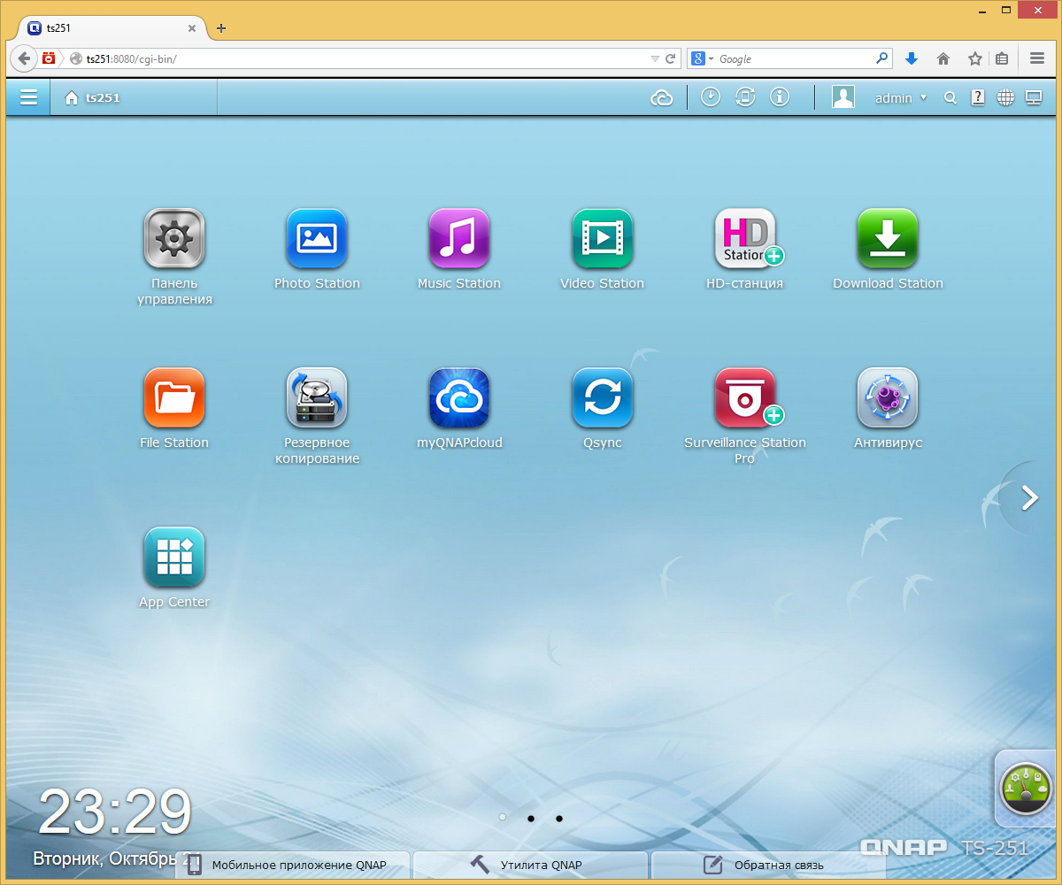 Веб-интерфейс настройки устройства аналогичен тому, что мы видели в прошлых тестах моделей этого производителя. Он оформлен в виде рабочего стола ПК — со значками вызова программ и сервисов в центре страницы, меню, строки состояния, виджетом мониторинга, часами, контекстным меню пользователя и другими элементами. Предусмотрен перевод на несколько языков (включая русский). Работает он достаточно быстро даже при значительной нагрузке на сетевой накопитель. Допускается использование протокола HTTPS для работы с интерфейсом. Сертификат при этом может быть самоподписанный или полученный официально и загруженный в накопитель. Номера портов для доступа к системе пользователь может изменить. Внешний вид страницы входа также можно поменять, если предложенный по умолчанию вариант чем-то не подходит.