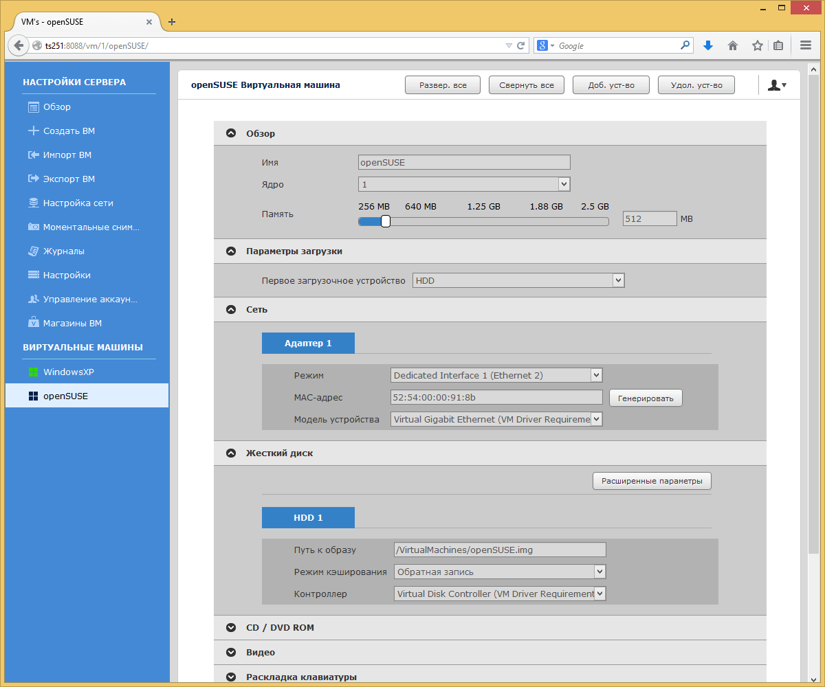 А вот что появилось нового и интересного — станция виртуализации. С точки зрения аппаратной конфигурации сетевого накопителя, наличие второго сетевого контроллера и большой объем оперативной памяти будут здесь полезны, однако не стоит забывать, что процессор используется относительно медленный и не стоит ожидать, что на нем можно будет запустить пару-тройку мощных серверов. Познакомимся с этой функцией поближе. Для работы сервиса необходимо создать отдельную папку и обеспечить подключение второго сетевого контроллера к коммутатору. Обратите внимание, что при работе данной функции, один из контроллеров полностью забирается под нее и реализовать два сетевых подключения или режимы балансировки и отказоустойчивости для самого сетевого накопителя становится невозможным. Сервис имеет собственную базу пользователей, которым можно выдавать индивидуальные права на работу с виртуальными машинами.