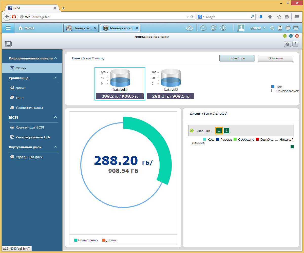 Поддерживается в данной модели и работа с протоколом iSCSI. Причем не только для предоставления LUN другим сетевым устройствам, но и подключение удаленных томов к накопителю.