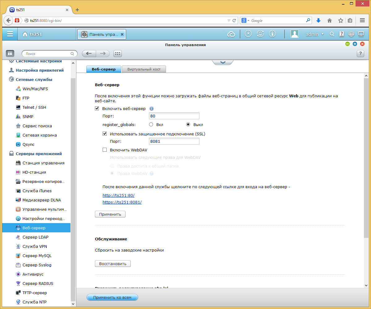 Следующим стоит упомянуть модуль для реализации веб-сервера. Две разных программы использовать для этой задачи непросто, а веб-интерфейс присутствует всегда. В настройках данного сервиса можно включить HTTPS, выбрать номера портов, создать несколько виртуальных хостов, отредактировать файл php.ini.