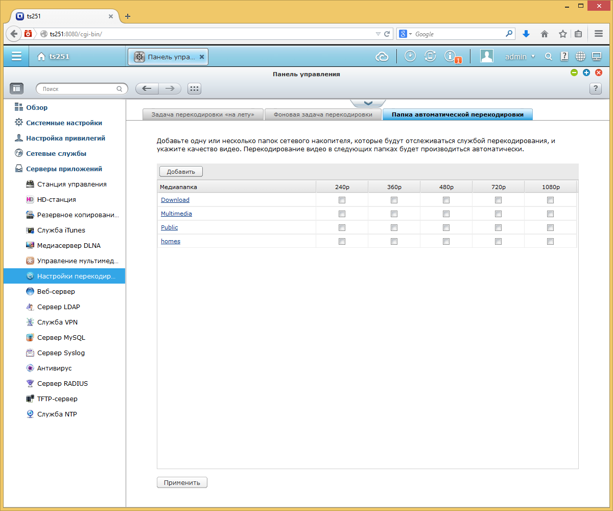 Учитывая использование в процессоре специальных блоков декодирования и кодирования видео, производитель реализовал возможности транскодирования видео прямо в сетевом накопителе. Отметим, что для использования аппаратного ускорения потребуется установить на устройство пару модулей. После этого можно запустить задачи для выбранных файлов в ручном режиме через File Station или использовать, например, Video Station для перекодирования в реальном времени для просмотра видео в браузере, если скорости канала не хватает на оригинальную версию. Пользователь может выбрать для каждой задачи требуемые целевые форматы — от 240p до 1080p. Проверка показала, что для исходных файлов с высоким разрешением (в частности 720p и 1080p) сервис имеет недостаточную производительность и не справляется с задачей в реальном времени. Кроме того, не забываем, что в случае наличия в видео нескольких звуковых дорожек, услышать вы сможете только одну и выбрать ее нельзя. Отметим, что для штатных серверов DLNA функция транскодирования не используется.